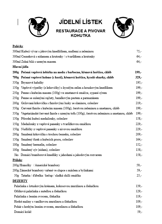 Mimo stálou nabídku 10 světlé výčepní, 12 světlého ležáku a 13 polotmavého speciálu vaříme různé speciály a novinky, kterými obohacujeme nabídku. Například Medový speciál, Kazbek, Kokrhell, Brojler a mnoho dalších.